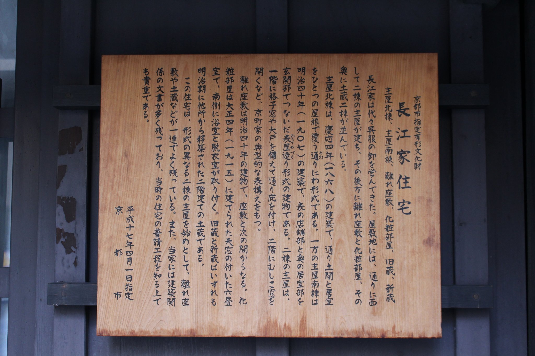 新基準が適用されるのは、京都市の指定有形文化財「長江家住宅主屋」の北棟約125平方メートルです。今年4月に運用が始まったこの新基準は町家の減少を食い止めるために京都市が制定したもので、標準的な構造の町家に限り、これまでより簡単な手続きで建築基準法を適用しないことを認めることができます。